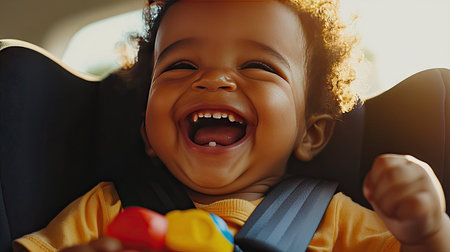 Close-up of a happy toddler in a child seat, giggling and playing with a toy, securely fastened with seat belts.