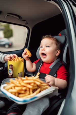 obese boy girl eating fast food, hamburger, french fries - unhealthy eating concept illustration generative ai art