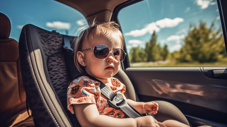 Small child rides in car seat in auto wearing sunglasses. Generative AI