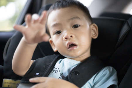 1 Year Old Adorable Asian Boy Playing and Looking Around in the Car Portrait. Family Plays and Learn in Safety Place for Kid Concept. Front View Headshot CloseUp Copy Space, and Blurry Background.