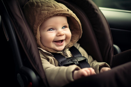 A joyful baby in a child seat, kicking their feet and smiling, the interior of the car bright and cozy.