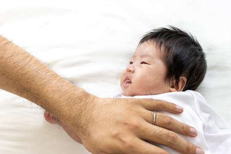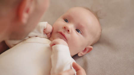 Dad playing with a newborn baby. Cute baby is trying to pronounce sounds while looking at his dad. Face of an active Caucasian baby looking at a parent. Father is playing with his baby.