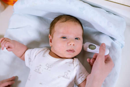 Measuring babys temperature with contactless thermometer. Mom measures the babys body temperature with a thermometer in the ear
