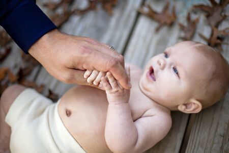 Funny newborn child gripping hand of his father. Baby boy lying on widen table. Parenthood, newborn child concept