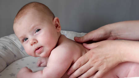Mother Giving Back Massage To Little Child. closeup. Mom Gives massage To Infant Baby. Prevention of Tremor. Female Hands Gently Massaging To Newborn Naked Body. Smears with Cream, Body care concept.