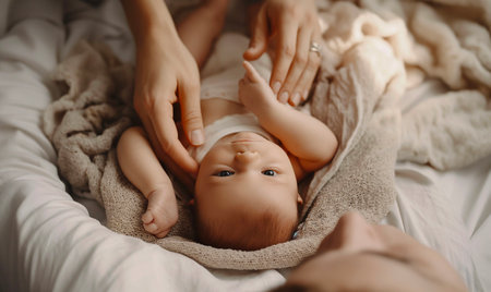 Mother holding newborn baby hands in hands. Mom taking care about infant child after taking bath. Parents childcare