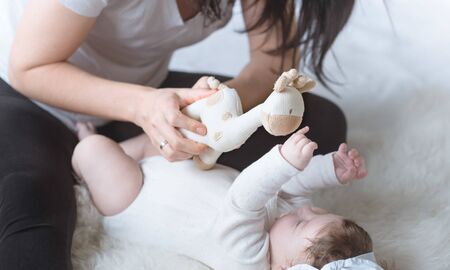 Mom plays with a toy with her newborn daughter, lying on the bed, top view. The concept of motherhood and child development.
