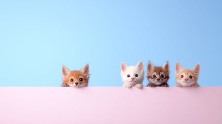 A group of four small, fluffy kittens with various fur colors, including ginger, white, and tabby, are playfully peeking over the edge of a pink surface, their heads and front paws visible.