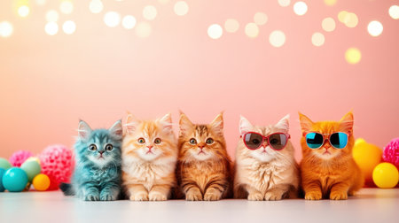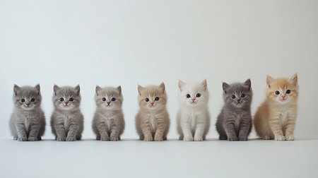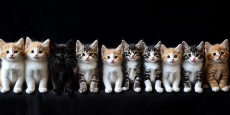 Vibrant row of playful multi colored kitten cats sitting together in adorable display