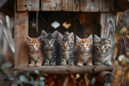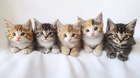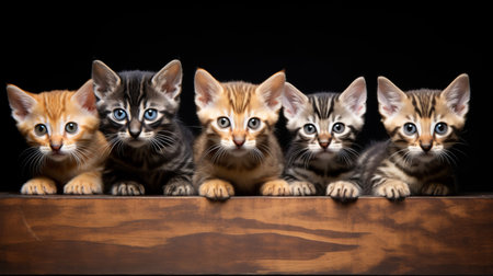 Five adorable kittens pose together, showcasing their playful and charming personalities. Perfect for animal lovers, this image captures youthful joy and companionship.