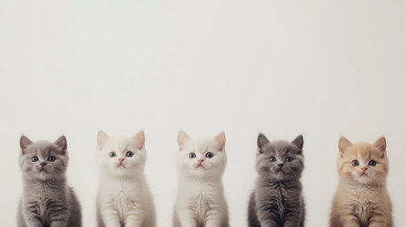 Five charming kittens of various colors sit in a row, showcasing their adorable expressions against a soft neutral backdrop, perfect for animal lovers.