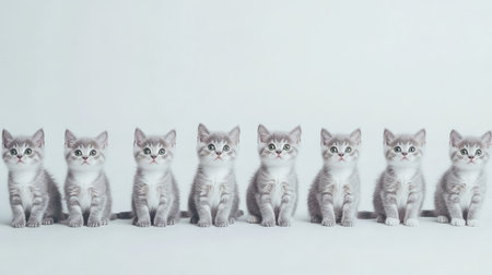 A charming lineup of six adorable British Shorthair kittens, showcasing their playful personalities in soft colors against a minimalist backdrop. Perfect for cat lovers!