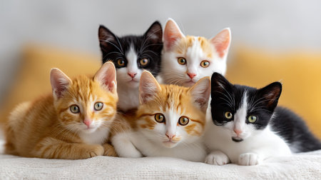 A heartwarming scene featuring a group of adorable kittens, showcasing their big, expressive eyes and fluffy fur, creating a cozy and playful atmosphere.