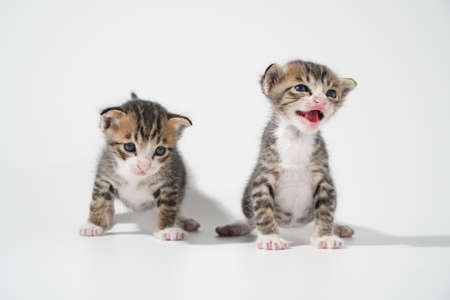 Studio portrait of an adorable tabby kitten gazing intently at camera against white background
