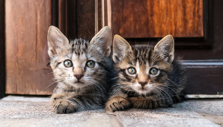 Curious cats sit closely, eyes wide as they explore their surroundings.