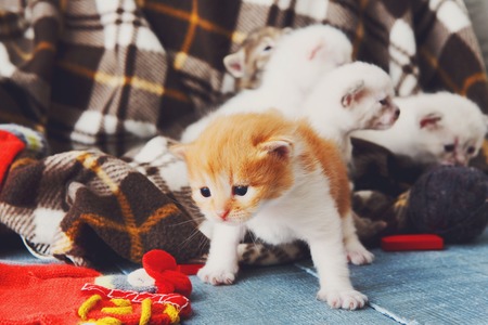 Adorable group of fluffy kittens cuddled in a soft plaid blanket on a striped couch
