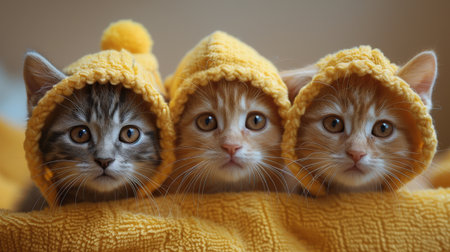 Playful kittens in colorful hoodies cute scene indoor vibrant colors adorable pets