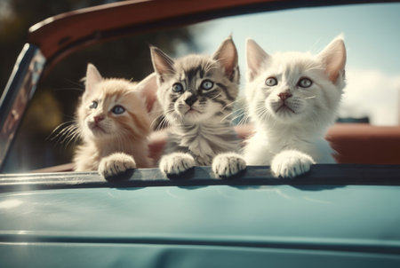Group of three adorable fluffy kittens in car. Soft furry feline little pets in vintage automobile. Generate ai