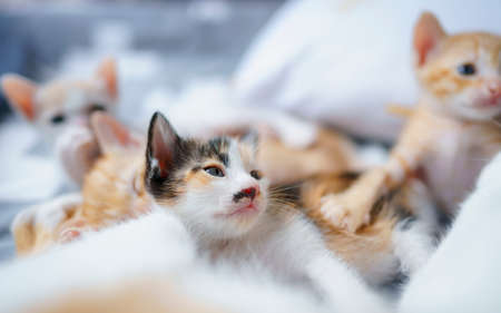 Group of kittens looking at mother cat with innocence in bed. Selective focus.