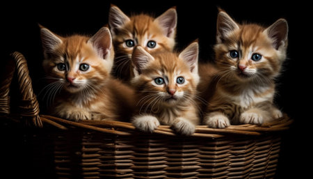 Five charming kittens of different colors gathered in a cozy basket. Their playful expressions and soft fur make this a delightful scene for any animal lover.