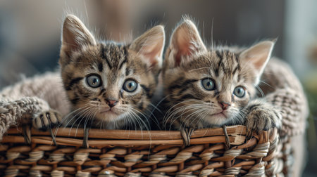 Cute fluffy kittens peeking out in a wicker cozy basket against an apartment background with space for text. High quality photo