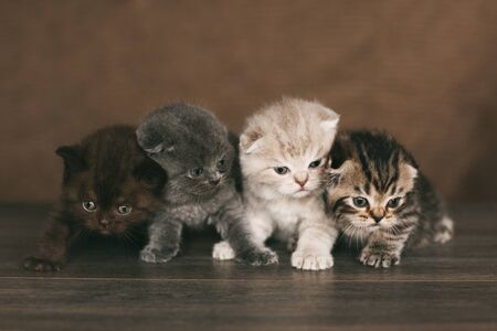 A delightful lineup of British Shorthair kittens showcasing various colors and playful expressions. Perfect for conveying cuteness and charm in any project.