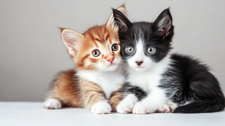 Two adorable kittens snuggle together in a cozy indoor space, showcasing their playful nature and affectionate bond. Their expressive eyes and soft fur evoke warmth and joy.