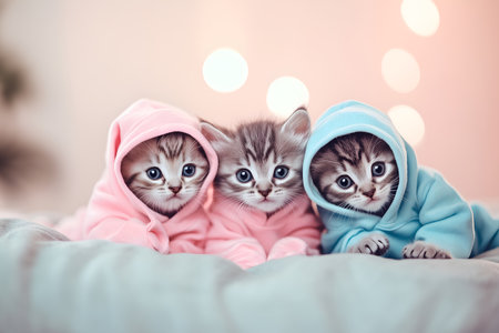 Three adorable kittens wearing stylish hoodies sit closely together on a bed, looking curious and playful.