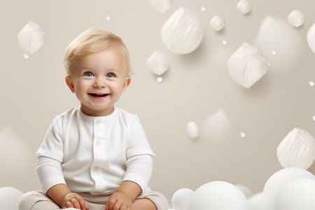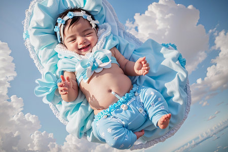 Happy baby smiling against a bright blue sky with fluffy clouds and a rainbow, showcasing innocence and joy in a colorful setting