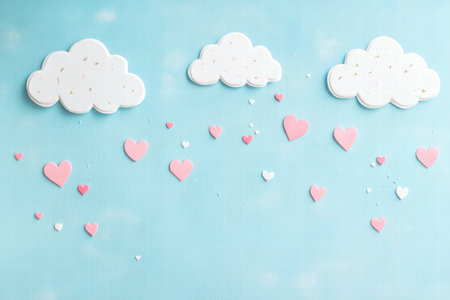 White clouds and red paper hearts in the form of rain on a blue background. Abstract background with paper-cut shapes. Sainte Valentine, mother's day, birthday greeting cards, invitation, celebration concept.