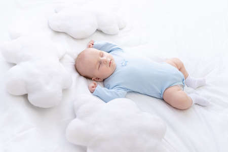 baby boy sleeps on the bed lying on his back in blue pajamas with his hands up among the pillows of clouds, healthy newborn sleep