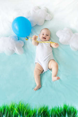 a baby with a balloon in his hand on a blue sky background with clouds, the concept of travel and summer holidays