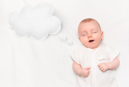 4 month old baby sleeping cute, conversation cloud made from copy space pillow lying nearby