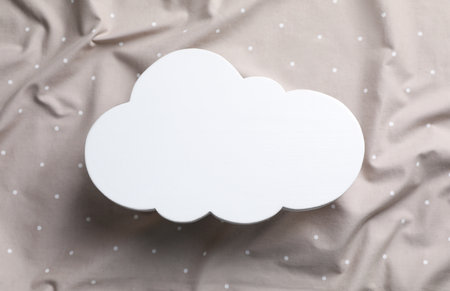 Cloud shaped child's night lamp on beige fabric, top view
