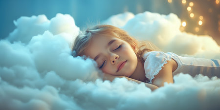 Cute little girl sleeping in a white fluffy cloud. fairytale
