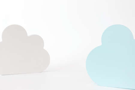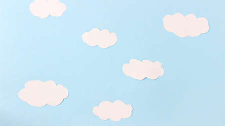 Paper white clouds made of paper float across the blue sky made of paper. Top view.