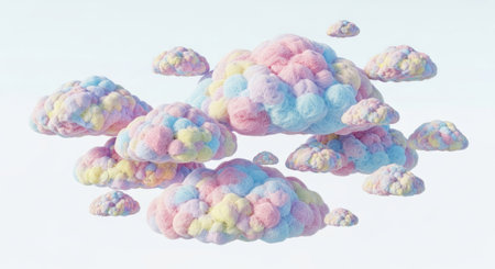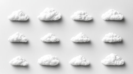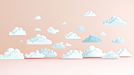 Fluffy white clouds line up against a soft backdrop, creating a calming visual effect.