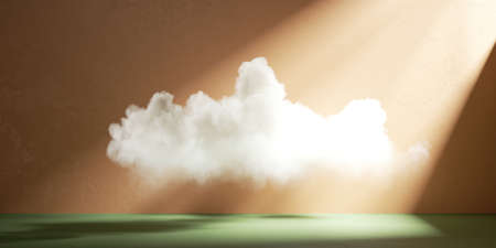 3d render. White fluffy cloud levitates in empty room with green floor, isolated on peachy background. Modern minimal gallery concept