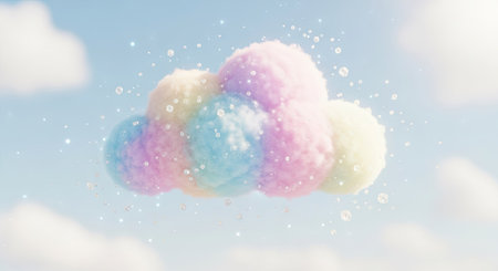 Fluffy clouds adorned with colorful candies and adorable animal figures drift through a soft pastel sky, creating a sweet and magical scene.