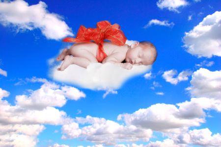 Little baby angel sleeps sweetly on a cloud in the sky