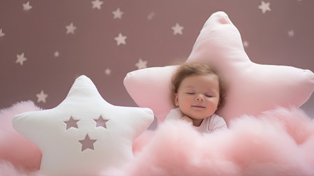 Cute newborn baby sleeping on a cloud with stars in the background