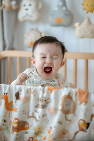 Cute baby crying in crib at home. Adorable little boy in nursery