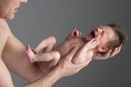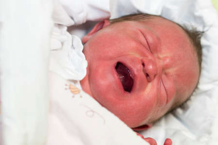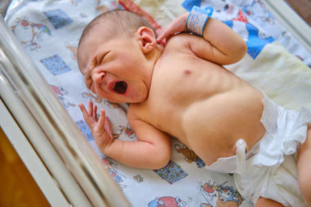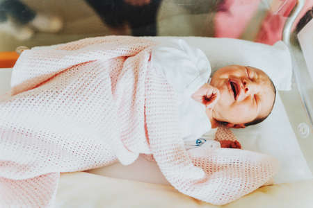 crying newborn baby infant in the hospital, the first hours of the new life, one days after birth