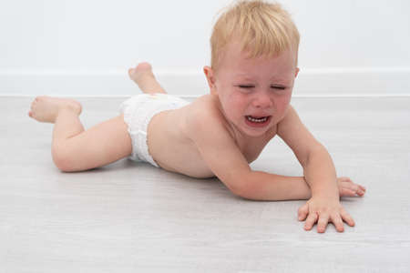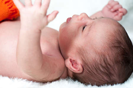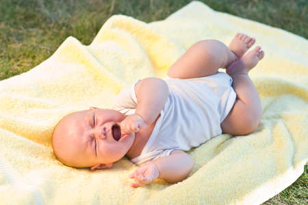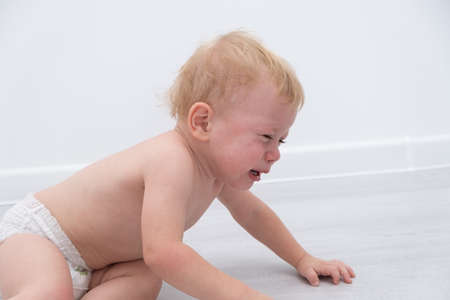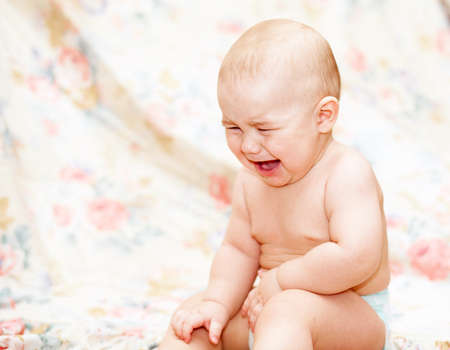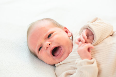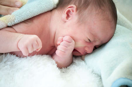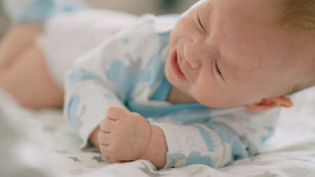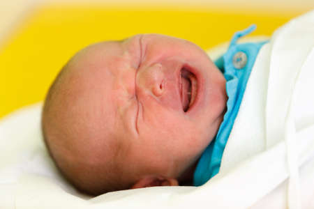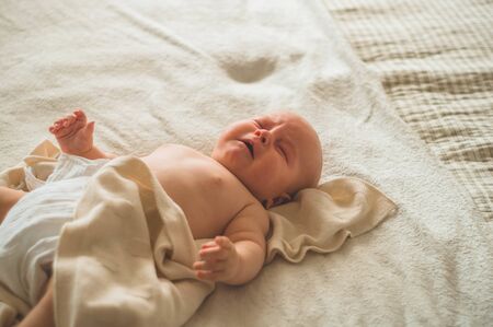 Newborn crying baby boy. Children cry. Bedding for kids.Healthy little kid shortly after birth.