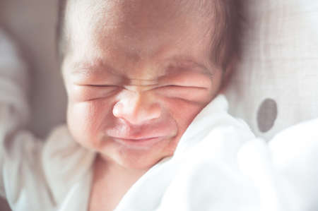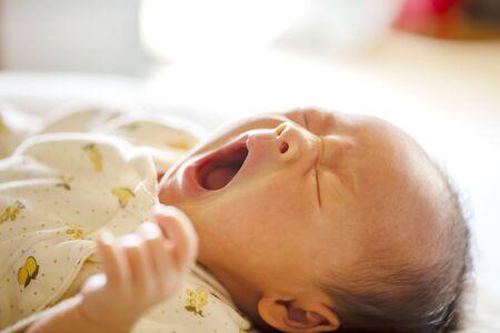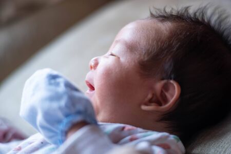 Closeup face of little asian newborn baby yawning while lying on the bed.