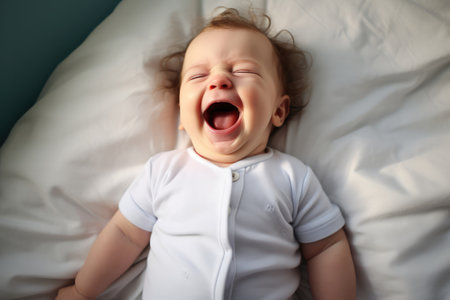 Hungry baby crying lying in bed on a white sheet, top view. Copyspace