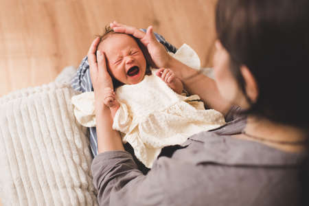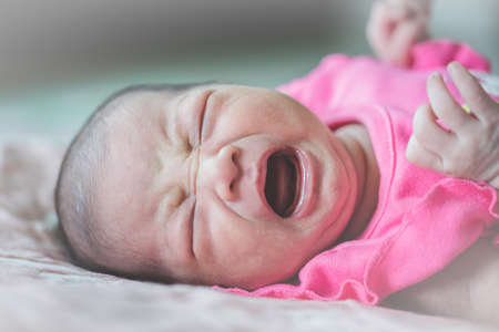 Sweet and cute small little newborn baby is hungry and upset and cry strongly inviting her parents to feed her and solve her problem. Stomach cramps