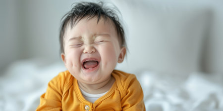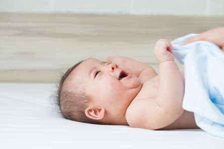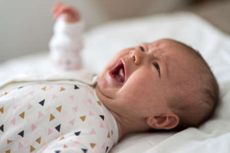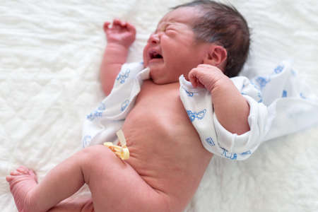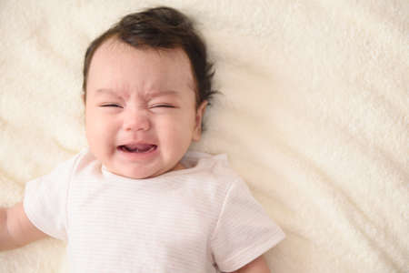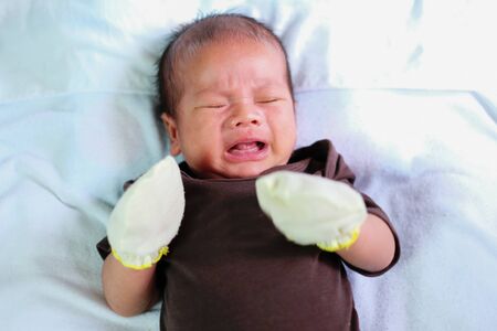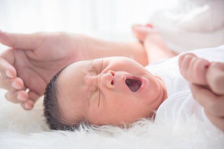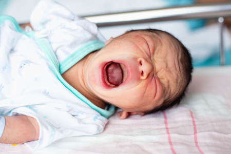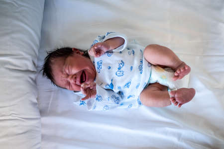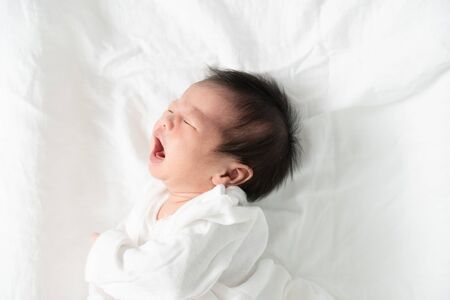 Crying and angry Newborn baby boy lying on white bed at home.Infant baby screaming very hungry or stomach pain.sick asian baby crying and having fever.Tired baby crying concept