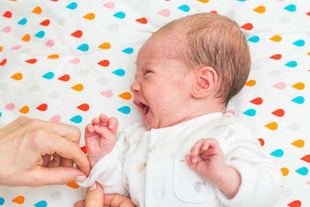 Newborn baby screaming while her mother is dressing her and buttoning her sleeve