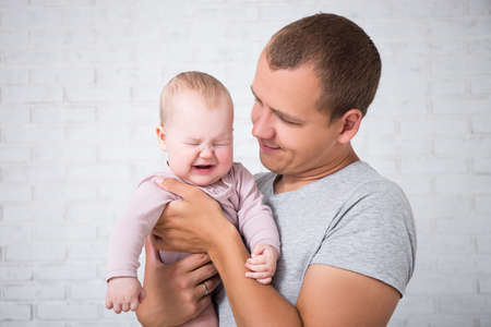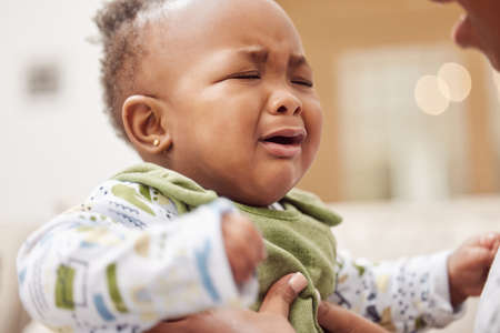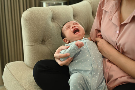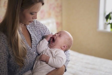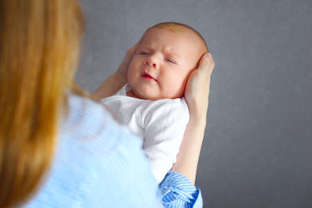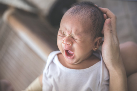 Small crying baby in the arms of his mother. Parenthood, baby care, Healthcare.